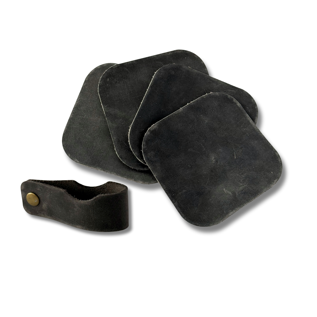 Set de 4 Suporturi de Pahar (Coasters): Protecție cu greutate pentru suprafețele tale. Realizate din piele naturală densă, aceste suporturi nu doar că absorb discret vibrațiile și protejează împotriva condensului, dar aduc o unitate vizuală incontestabilă mesei tale de lucru sau de protocol.